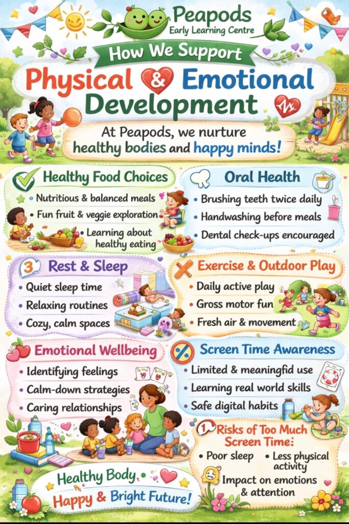 At Peapods Early Learning Centre, children’s wellbeing is at the heart of everything we do. We support both physical and emotional development through healthy meals, active outdoor play, rest and relaxation routines, and caring relationships with our educators. Children are encouraged to recognise their feelings, build friendships, and develop confidence in a safe and nurturing environment. By promoting healthy habits, curiosity, and positive social experiences, we help children grow into happy, resilient learners ready for the future.